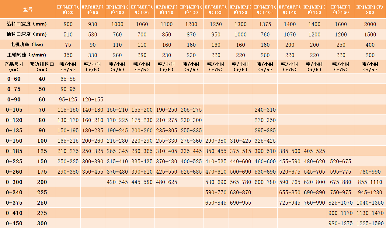 HPJ系列顎式破碎機(jī)型號(hào)及技術(shù)參數(shù):